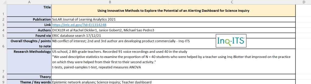 Finally, I’ve added sections for practical implications, identification of a research gap, acknowledged limitations, and specific questions or links to my work. I don’t always complete all of these rows; sometimes this information is too tightly wound with the overall discussion to spend time making arbitrary decisions on which section I want to use. In this case, everything goes under knowledge claims.