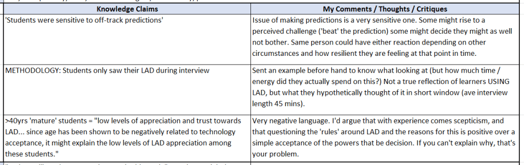 The main section, and most important, I have titled ‘knowledge claims’. I use two columns, copying a section of original text (or a summary) into the left, and writing a critical reflection in the right. My self imposed rule is to never leave the right column blank… if I don’t have something to say about it, then why note it down?